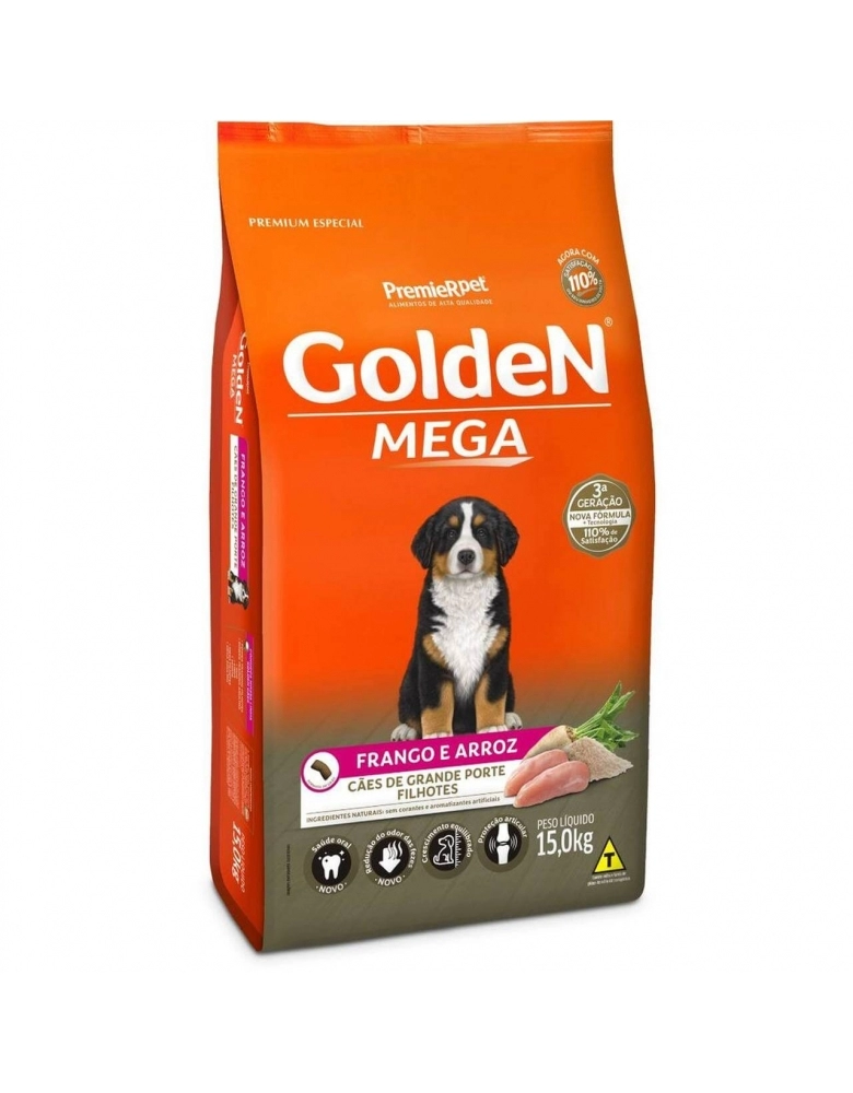 A Ração Golden Mega Cães Filhotes Frango & Arroz 15kg foi desenvolvida especialmente para cães de raças grandes e gigantes que pesam 30 kg ou mais.