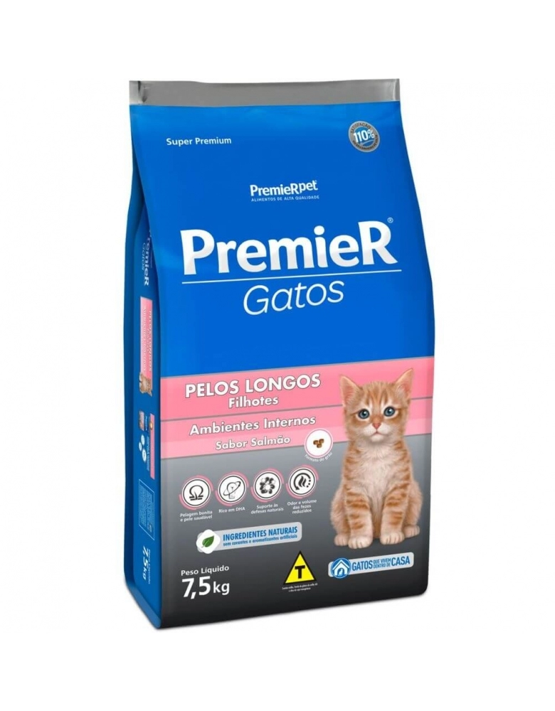 Ração Premier Ambientes Internos Gatos Filhotes Pelos Longos Salmão 7,5kg