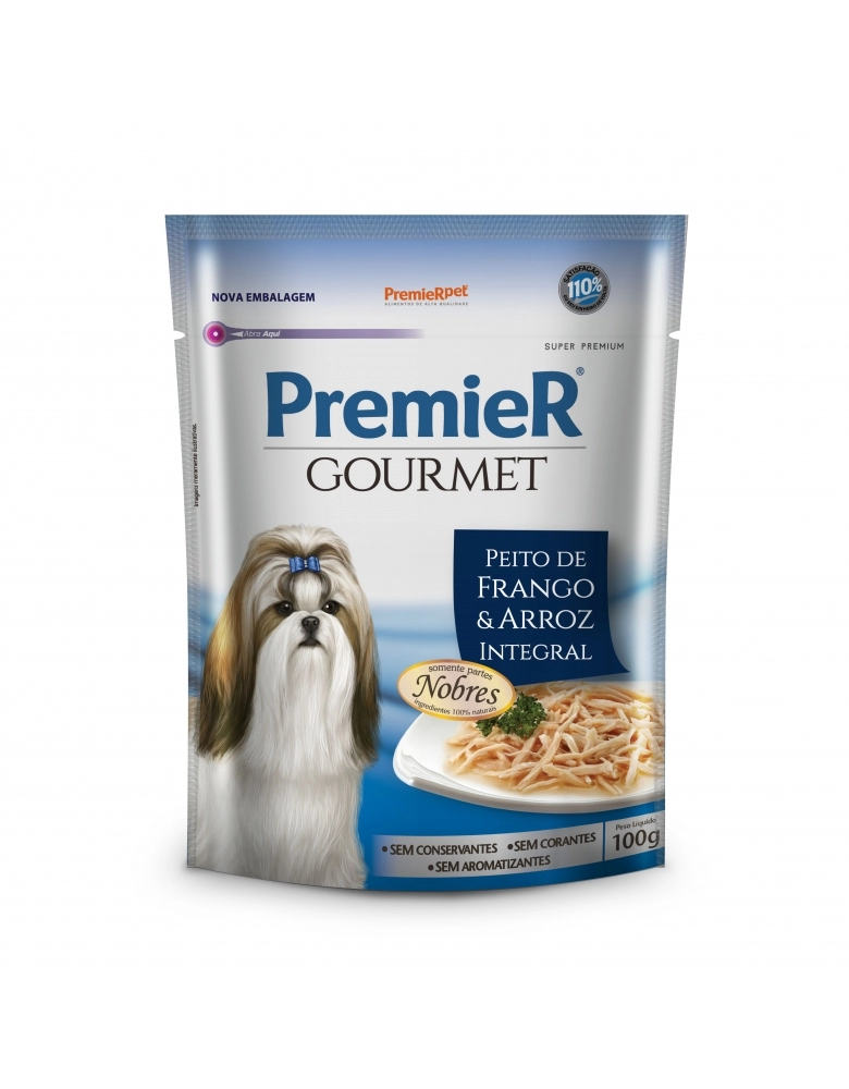 PremieR Gourmet Cães Adultos Porte Pequeno – Frango e Arroz Integral é um alimento Super Premium que faz parte da linha PremieR Gourmet, uma linha de alimentos úmidos especialmente desenvolvida para retribuir todo amor e carinho que os cães nos proporcionam. PremieR Gourmet Cães Adultos Porte Pequeno Frango e Arroz Integral é nobre, nutritivo e natural, pois não contém corantes e aromatizantes artificiais, conservantes e nem ingredientes transgênicos.