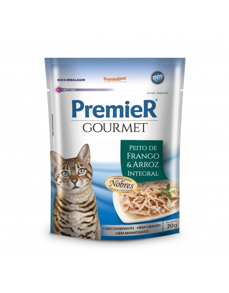 PremieR Gourmet Gatos Adultos Castrados – Frango e Arroz Integral é um alimento Super Premium que faz parte da linha PremieR Gourmet, uma linha de alimentos úmidos especialmente desenvolvida para retribuir todo amor e carinho que os gatos nos proporcionam. PremieR Gourmet Gatos Adultos Castrados Frango e Arroz Integral é nobre, nutritivo e natural, pois não contém corantes e aromatizantes artificiais, conservantes e nem ingredientes transgênicos.